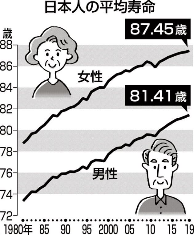 「2019年の日本人の平均寿命は女性が87.45歳、男性が81.41歳となり、ともに過去最高を更新したことが31日、厚生労働省が発表した簡易生命表で分かった。前年に比べ、女性は0.13歳、男性は0.16歳延び、いずれも8年連続のプラスとなった。女性は5年連続で世界2位、男性は3年連続で3位だった。」とのことです。